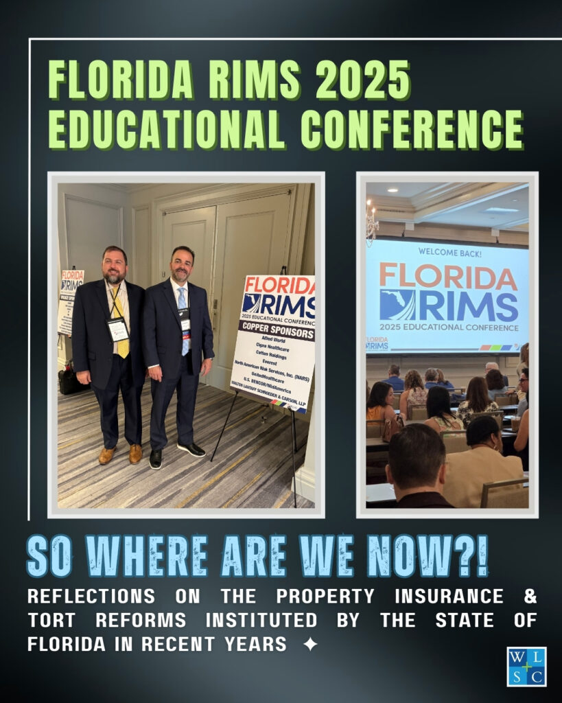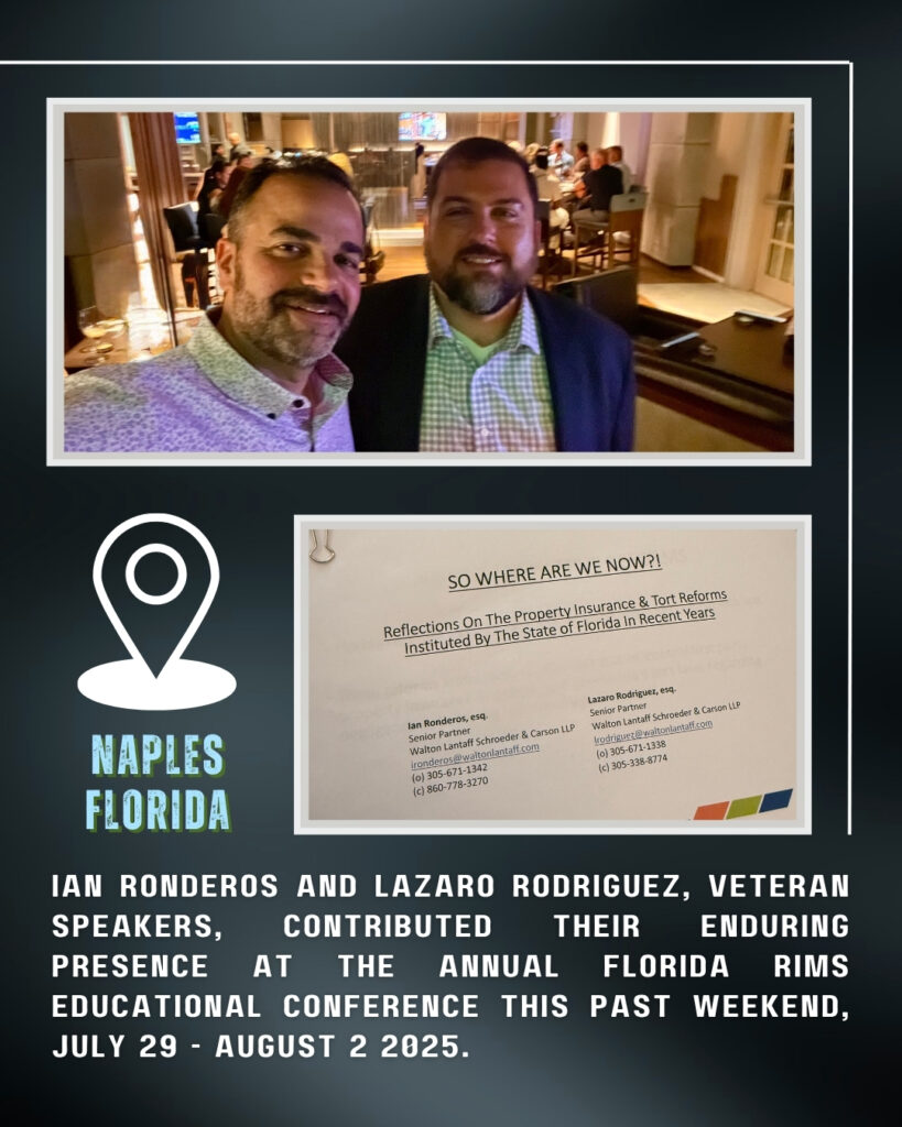 This past weekend at the Florida RIMS 2025 Education Conference, Laz Rodriguez and Ian Ronderos shared their expertise on the ongoing impact of Florida’s property insurance and tort reforms. Their presentation, So Where Are We Now?!, provided a comprehensive update on the legal and business implications of recent reforms, offering essential updates to risk management professionals in attendance. As seasoned speakers and attendees, Laz and Ian’s continued presence and contributions remain an invaluable element of the annual conference, held this year in Naples. This engagement exemplifies their commitment to sharing knowledge and guiding the industry in the ever-evolving landscape of property and tort law!
